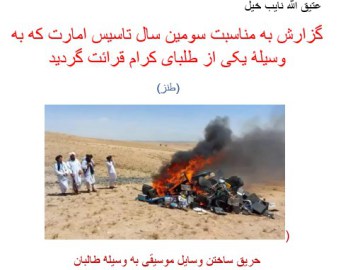 این بود گزارش کارنامۀ سه سالۀ امارت اسلامی که توسط چهار تا ادیتور اصلاح و توسط سه تا بادیگارد پاکنویس و توسط این جانب به حضور شما قرائت گردید. انا لله و انا الیه راجعون